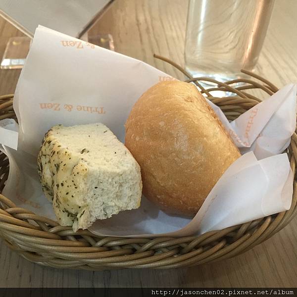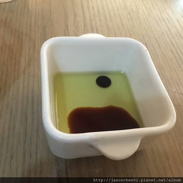 現烤熱麵包,鬆軟沾上油醋,很爽口‧