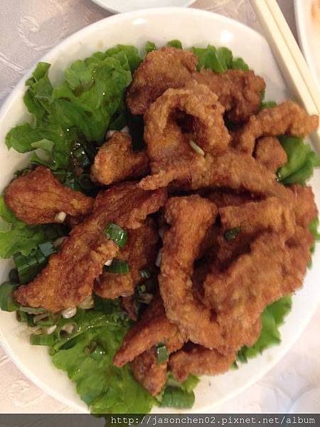 椒鹽排骨(起鍋的油蔥粒與炸透的無骨排骨一起吃,味道絕佳,不需再沾胡椒鹽)