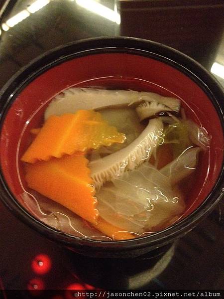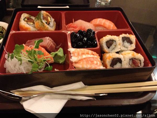 等了十來分鐘,ㄧ盤看來很精緻的餐盒上了桌,包括了主餐盒、湯、日式涼麵