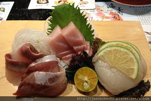 經典生魚片,由左至右分別至青甘(又稱鰤魚)、鮪魚、干貝;