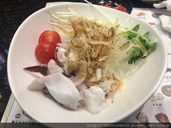 洋蔥軟絲沙拉,除了洋蔥軟絲還有豆苗茵、蕃茄,柴魚絲等