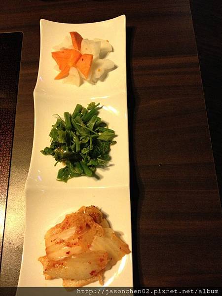 前菜三樣、分別是糖醋蘿蔔、龍鬚菜、泡菜