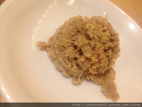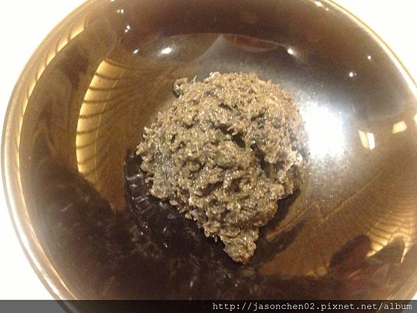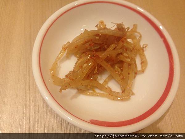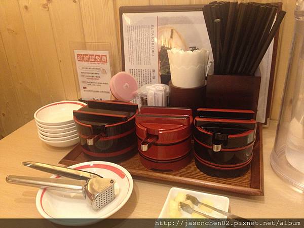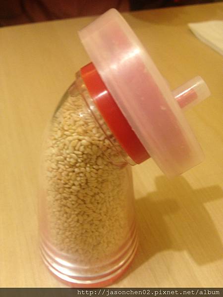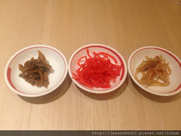 桌上有白水、三樣小菜(可無限使用)及芝麻研磨器