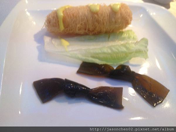 蝦捲,加了生菜葉及海帶結做裝飾,其實有點不搭‧