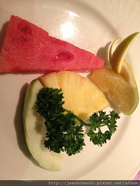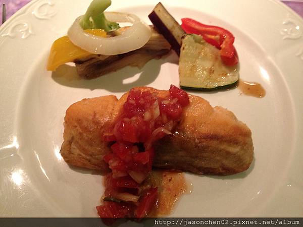 主菜是乾煎鮭魚,魚上方的番茄洋蔥醬很爽口‧這魚煎的真好吃‧