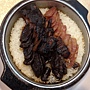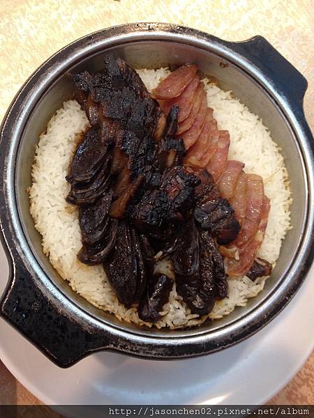臘味撈出置於盤中,將帶有鍋巴的飯與臘味汁攪拌