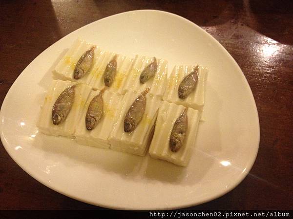 豆腐小魚( 非常簡單的一道菜,鋪陳且很特別,嫩豆腐切成小塊,每塊