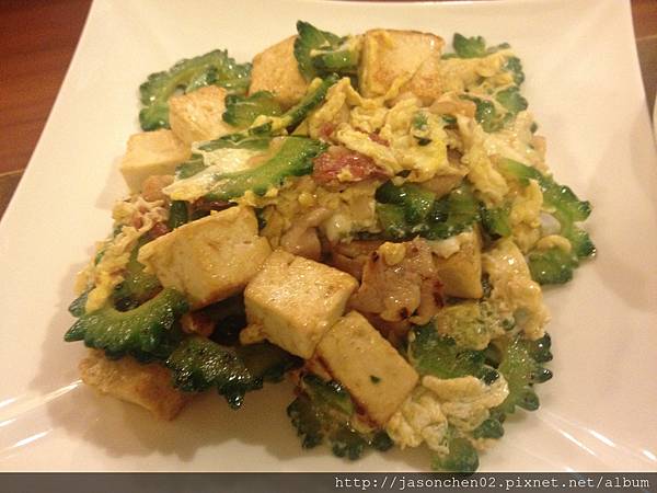 苦瓜炒蛋及煎豆腐(用的是沖繩的青色苦瓜)