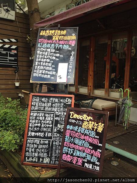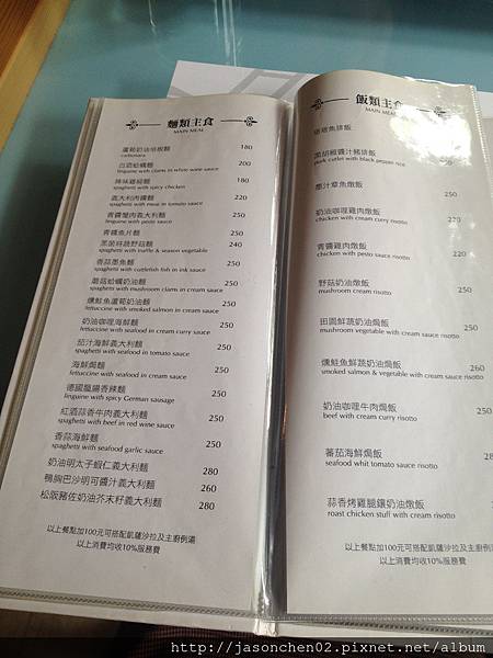 桌上的擺設及菜單,菜單大部分是義大利麵及燉飯