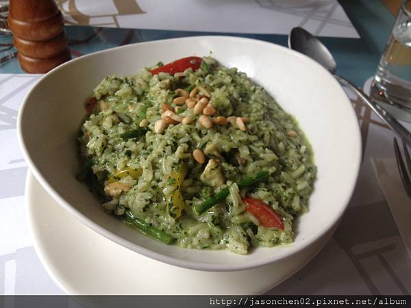 青醬燉雞飯,內有蘆筍、彩椒、松子、蘑菇及雞肉等