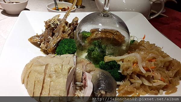 首先上的是四喜拼盤:蜇絲、醉雞、素鵝、子魚