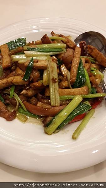 客家小炒,五花肉條、魷魚、芹菜、豆干