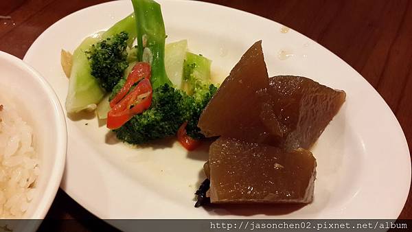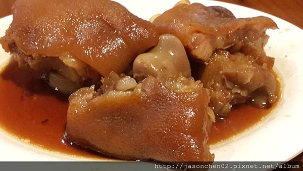 豬腳套餐:三塊豬腳+紅燒蘿蔔、綠花耶菜+玉米湯+雞油飯