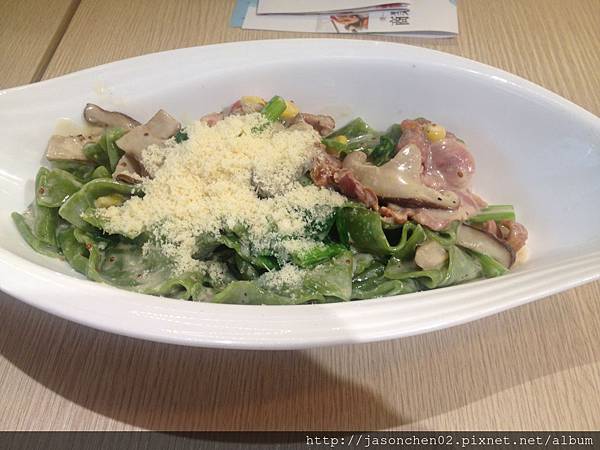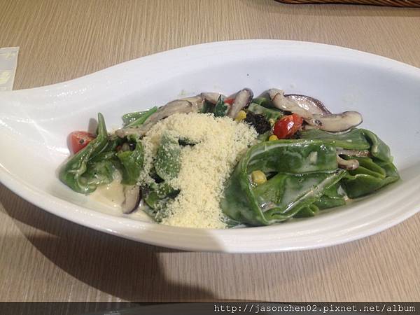 主菜是奶油松露蕈菇手工菠菜寬麵