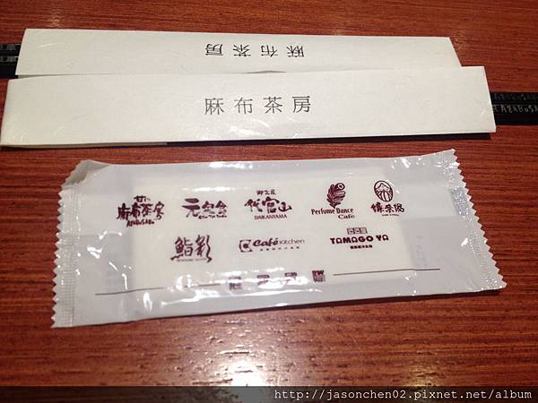 桌上餐具、紙巾都有店飾,濕紙巾的背面都是同一集團的