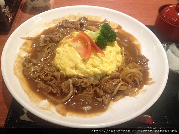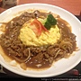 紅酒醬汁牛肉蛋包飯: 牛肉與洋蔥紅燴,中間蛋的下面是白飯‧