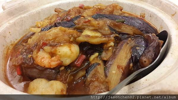 海鮮茄子煲,料非常的豐富,它的蝦個頭真大,微辣‧