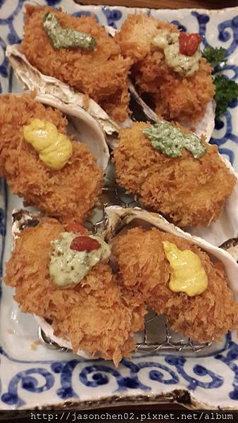三色牡蠣,分別為青醬、海帶、咖哩,