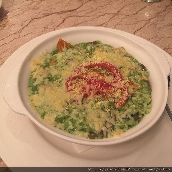 青醬野菇鮭魚燉飯,個人喜歡青醬的口味,還不錯吃‧