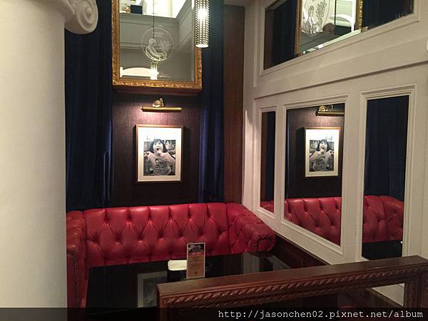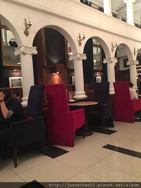 ,兩排的紅、藍高背椅,靠牆是隱密的談話區,則是紅皮沙發