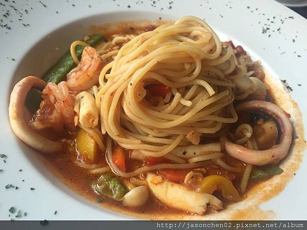 蕃茄海鮮義大利麵,海鮮配料不少‧
