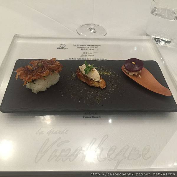開胃小品,右手邊的甜菜根配蘋果泥,