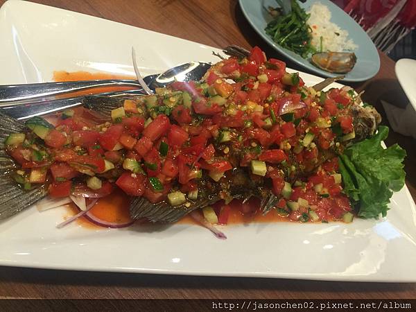 香酥酸辣鱸魚,魚先炸透,再把酸辣的汁及蕃茄澆淋在魚上