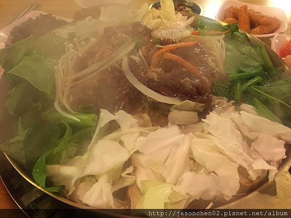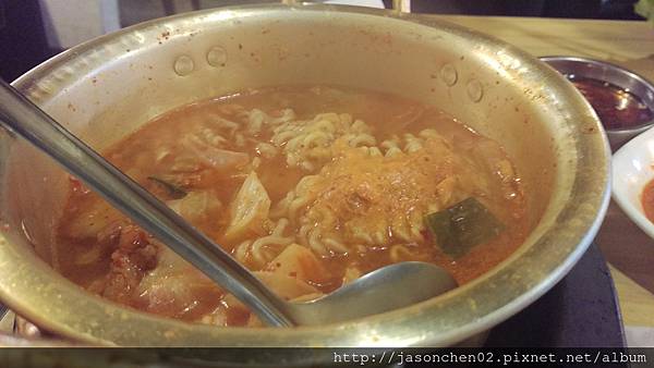 部隊鍋,有點像辣味大雜燴,除泡菜外,尚有