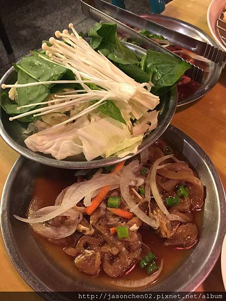 銅盤燒肉,有牛、羊、豬、雞等肉可供選擇