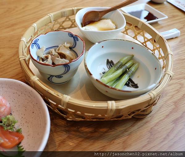 套餐除主菜外,還有蒸蛋、豆腐、醃四季豆、醬菜、甜蝦生魚片