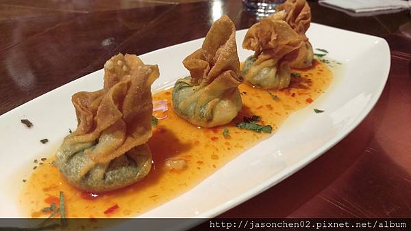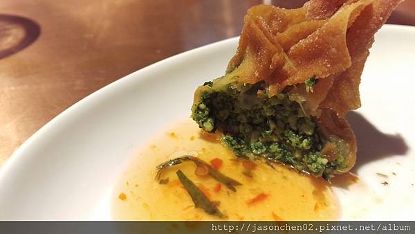 炸菠菜起司餛飩,餛飩內餡是札實的菠菜泥,好吃在它的醬料