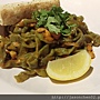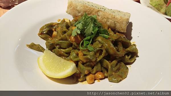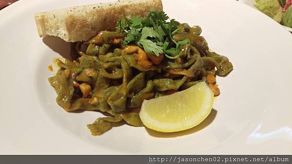 泰式酸辣醬手工菠菜寬麵,很有咬勁,味