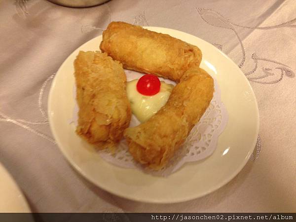 腐皮鮮蝦捲,上桌時是滾燙的,內餡的蝦子個個大而肥美