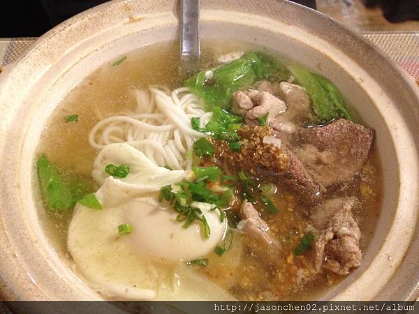 "小鍋米線",半熟的白煮蛋、肉片、豬肝,小砂鍋裡甚麼好料都有!