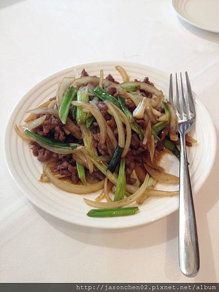 一般是小片牛肉片與葱炒,它卻用牛肉絲,蔥及大量洋蔥